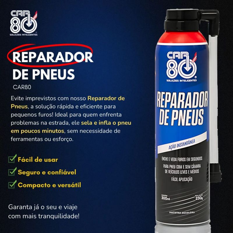 Seu novo aliado para viagens mais seguras e tranquilas! Quem nunca passou pelo inconveniente de um pneu furado no meio do caminho? Seja em uma longa viagem ou no trânsito do dia a dia, lidar com esse tipo de situação pode ser frustrante e até perigoso, principalmente em locais de difícil acesso ou à noite. Especificação Técnica: - Alta Durabilidade e Resistência - Conteúdo da Embalagem: 1 Reparador de 300ML Importante: - Garantia de 3 meses - O Fuscão Preto Auto Peças não se responsabiliza por mau uso do produto ou por instalações amadoras, recomendamos que a instalação seja feita por um profissional capacitado - As cores podem sofrer variações de tonalidades de acordo com o lote, com a configuração do seu dispositivo ou monitor - Preços e condições de pagamento válidos somente para compras no site Fuscão Preto - Imagens meramente ilustrativas - O valor anunciado se refere a cada unidade do produto.