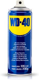 Lubrifica, penetra, dispersa a umidade, limpa e protege. Produto com mais de 2 mil usos! WD-40 Produto Multiusos elimina rangidos, expele a umidade, limpa e protege, solta peças oxidadas e libera mecanismos travados. A embalagem prática de 300ml aerossol tem um formato que facilita o seu manuseio. Mais fina e mais alta, é mais fácil de pegar! Ideal para usar em casa, no trabalho, no carro, etc. Também possui válvula 180º exclusiva que permite o uso com a lata de cabeça para baixo. Especificação Técnica: - Dispersa a umidade para prevenir a ferrugem e proteger sistemas elétricos e eletrônicos - Penetra para soltar peças presas e oxidadas - Lubrifica mecanismos de baixo atrito, eliminando rangidos - Limpa removendo óleo, sujeira, graxa e fuligem - Protege as superfícies metálicas contra ferrugem e corrosão Importante: - Garantia de 3 meses; - O Fuscão Preto Auto Peças não se responsabiliza por mau uso do produto ou por instalações amadoras, recomendamos que a instalação seja feita por um profissional capacitado; - As cores podem sofrer variações de tonalidades de acordo com o lote, com a configuração do seu dispositivo ou monitor; - Preços e condições de pagamento válidos somente para compras no site Fuscão Preto - Imagens meramente ilustrativas; - O valor anunciado se refere a cada unidade do produto.